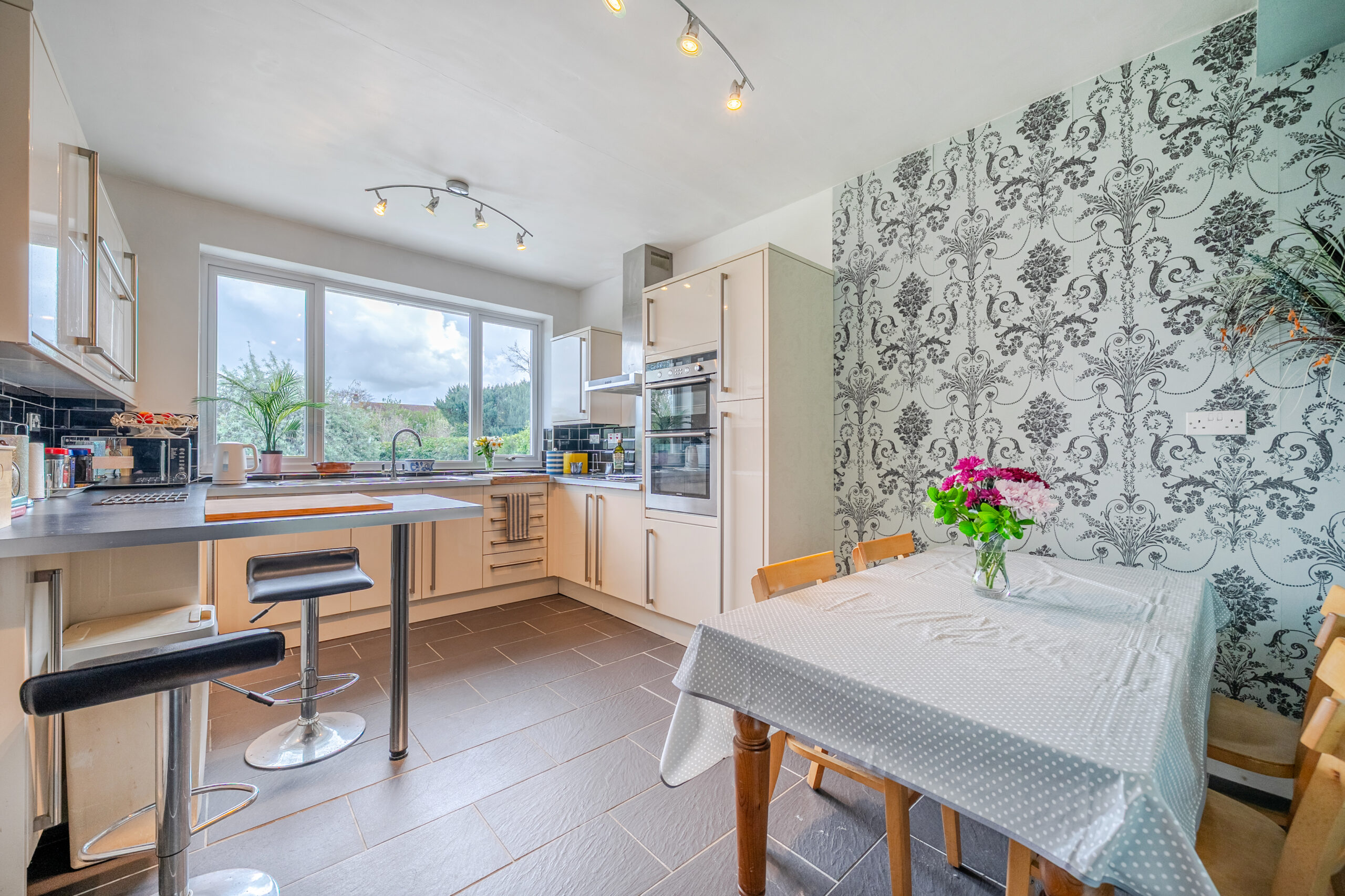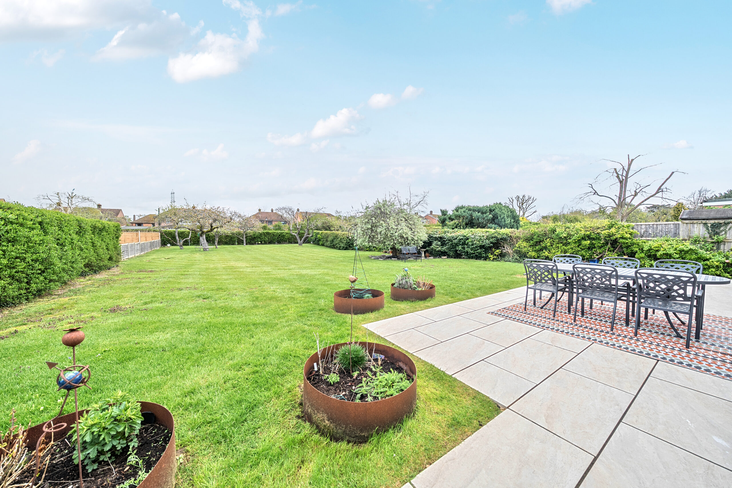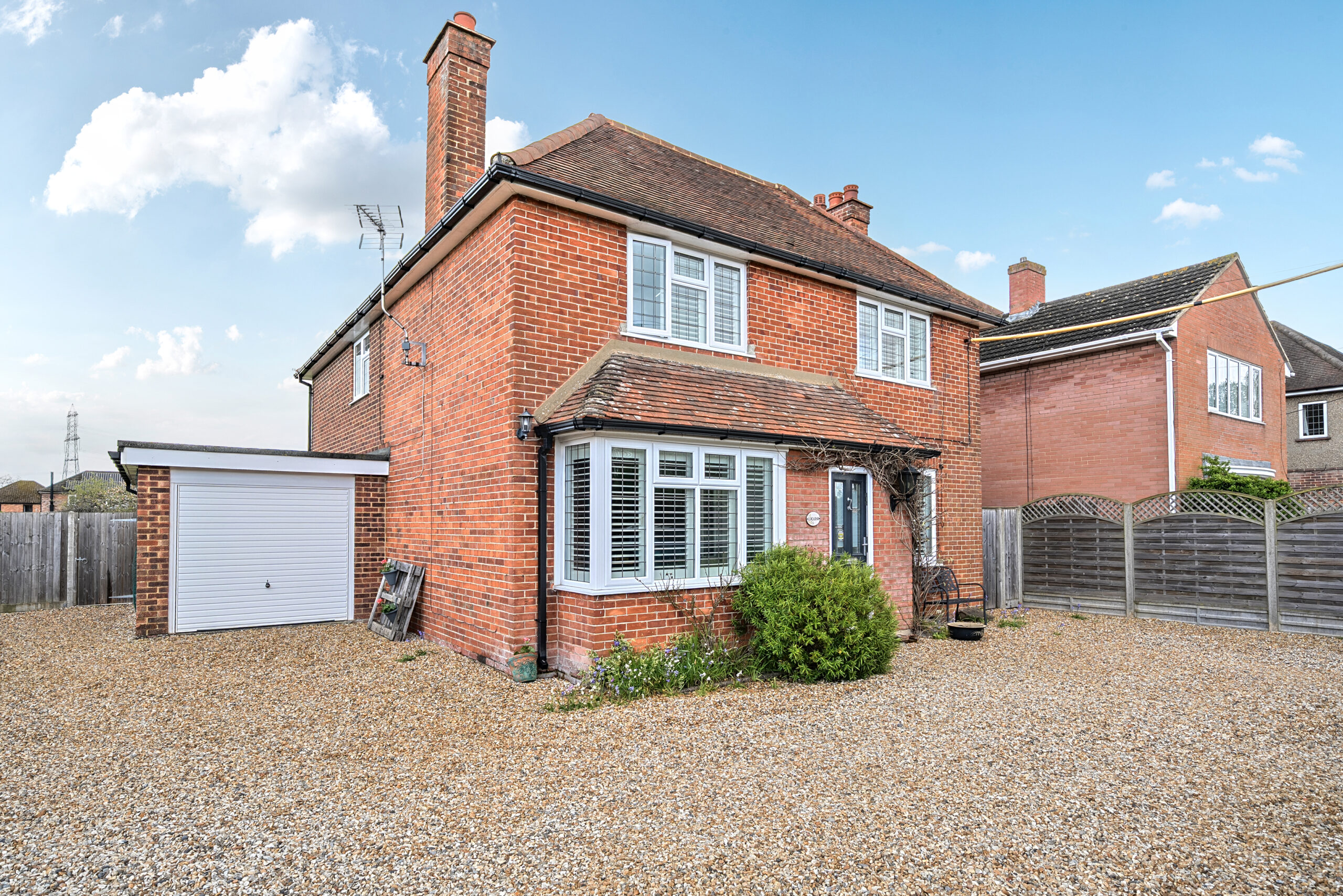 Outside, the scale of the plot truly comes into its own. A large porcelain-tiled patio area provides an extended social space, while the garden has been consistently maintained. To the front, new fencing, gates and a refreshed gravel driveway create a smart approach, alongside a refurbished garage.